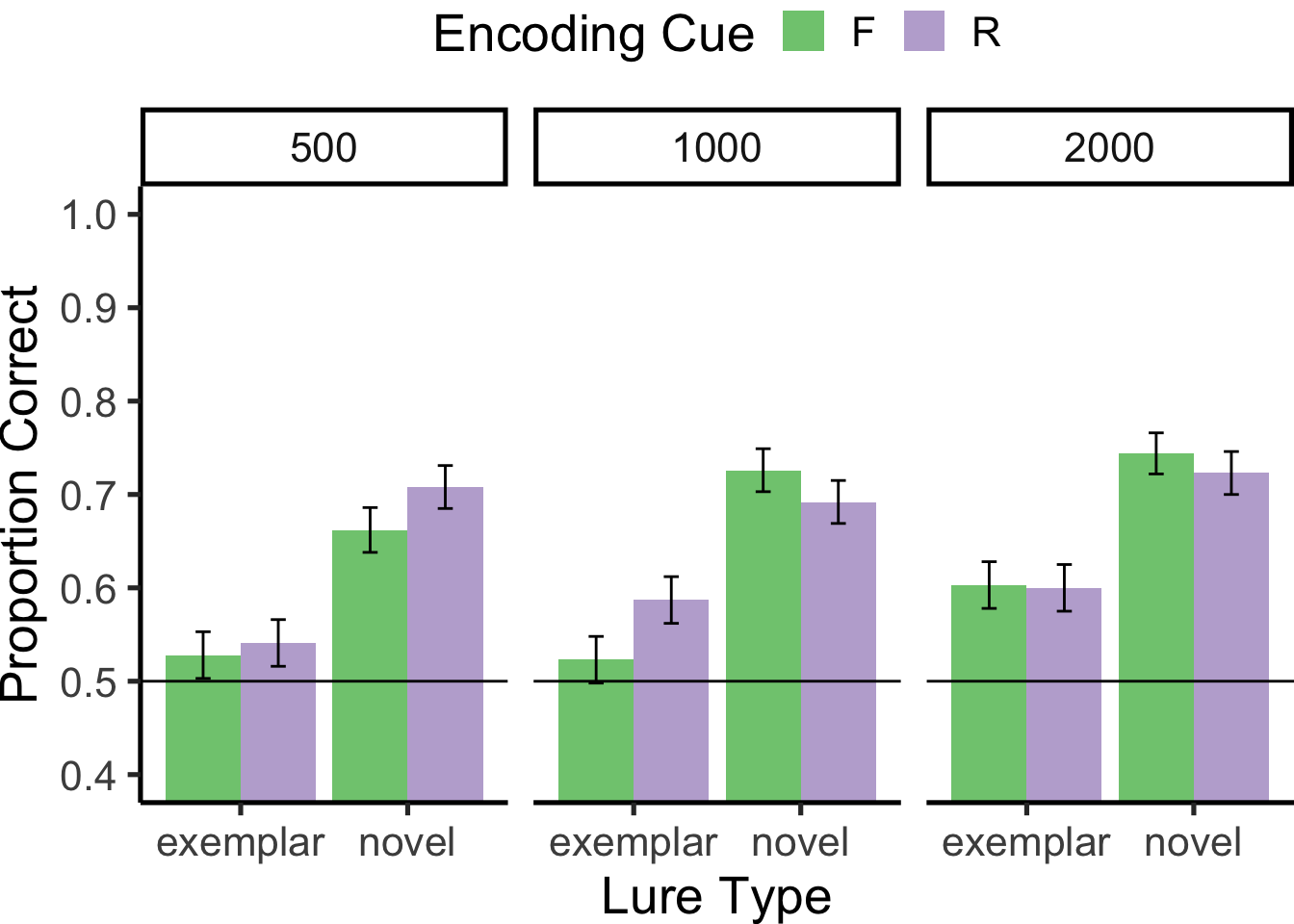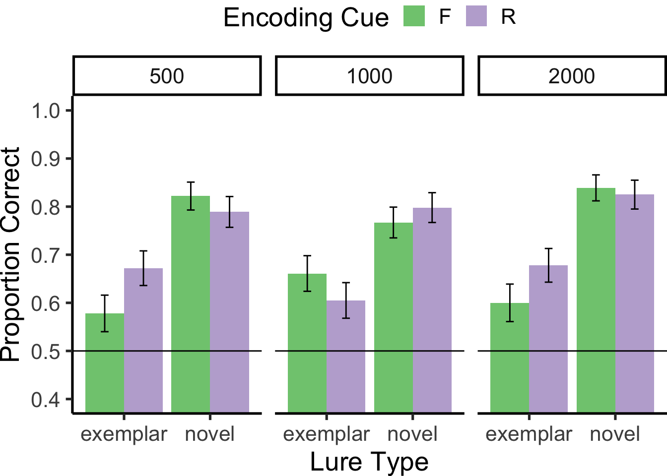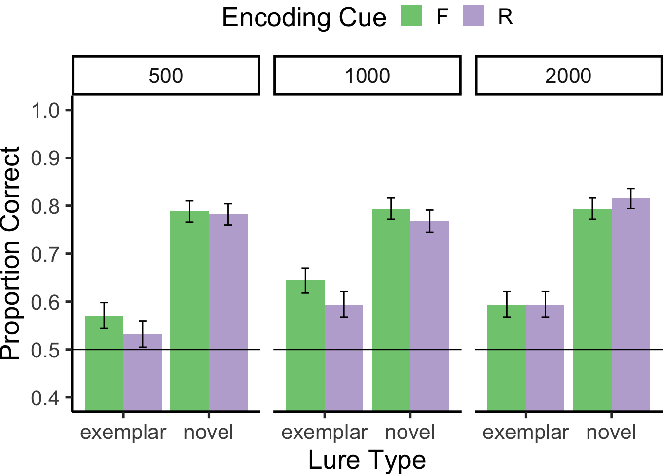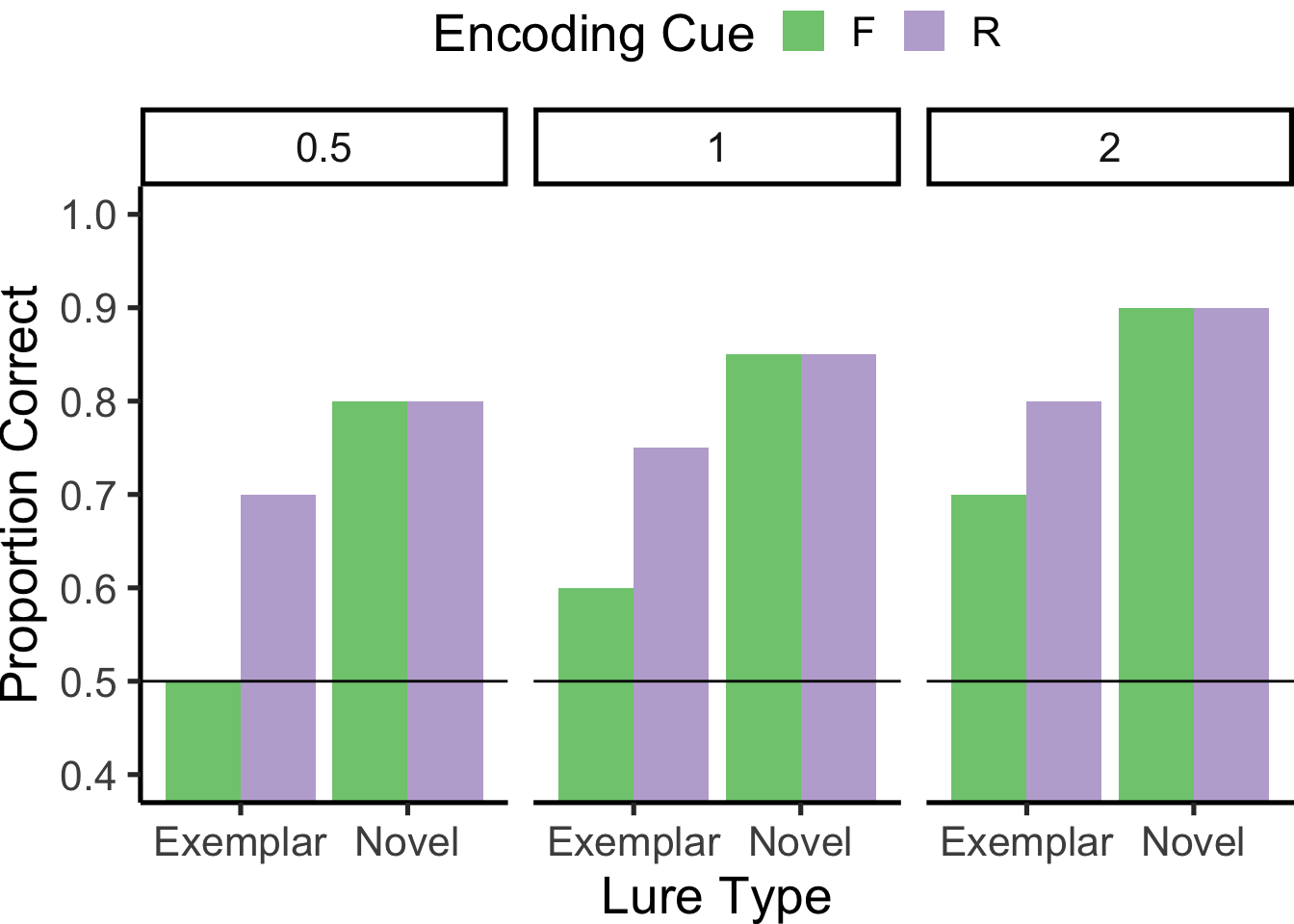 The effect was only observed for items given a more difficult recognition test, involving a similar (exemplar) lure.