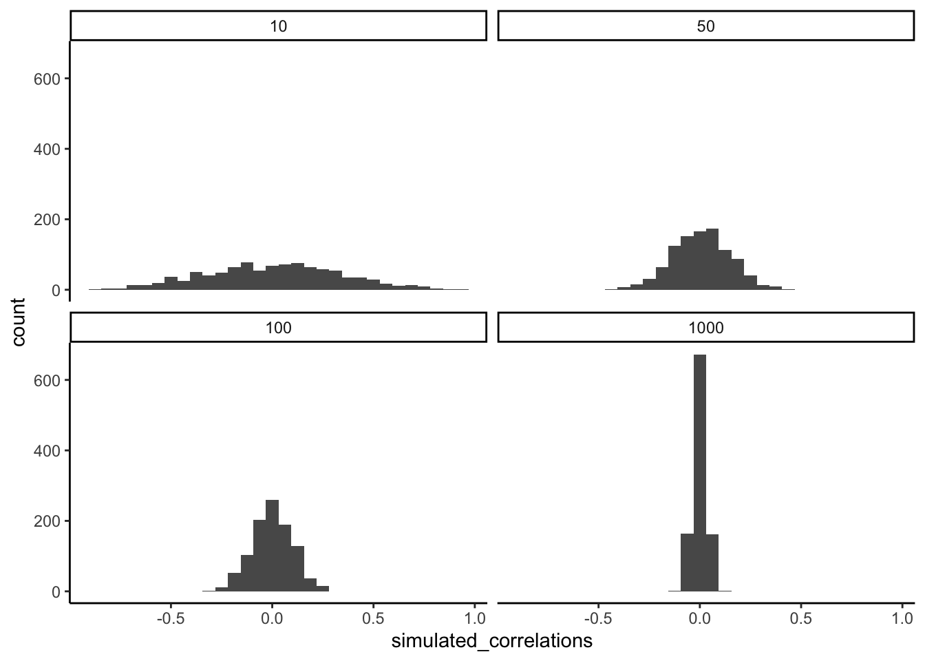 One take home here, is that increasing sample-size narrows the window of chance. So, for example, if you ran a study involving 1000 samples of two measures, and you found a correlation of .5, then you can clearly see in the bottom right histogram that .5 does not occur very often by chance alone. In fact, there is no bar, because it didn’t happen even once in the simulation. As a result, when you have a large sample size like n = 1000, you might be more confident that your observed correlation (say of .5) was not a spurious correlation. If chance is not producing your result, then something else is.