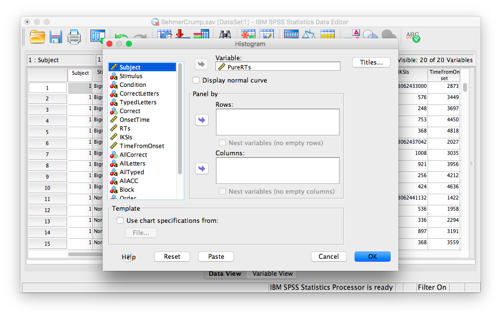 Notice that the RTs form a positively skewed distribution. Most RT measurements are on the lower end of the scale, and there are very few RTs that are higher than 5000ms. These measurements could have resulted from subjects falling asleep, looking at their phones, or being otherwise distracted in the middle of the experiment. We want to remove those values so they do not influence and mischaracterize our results. To do this, go to the top menu and choose Data, then Select Cases…